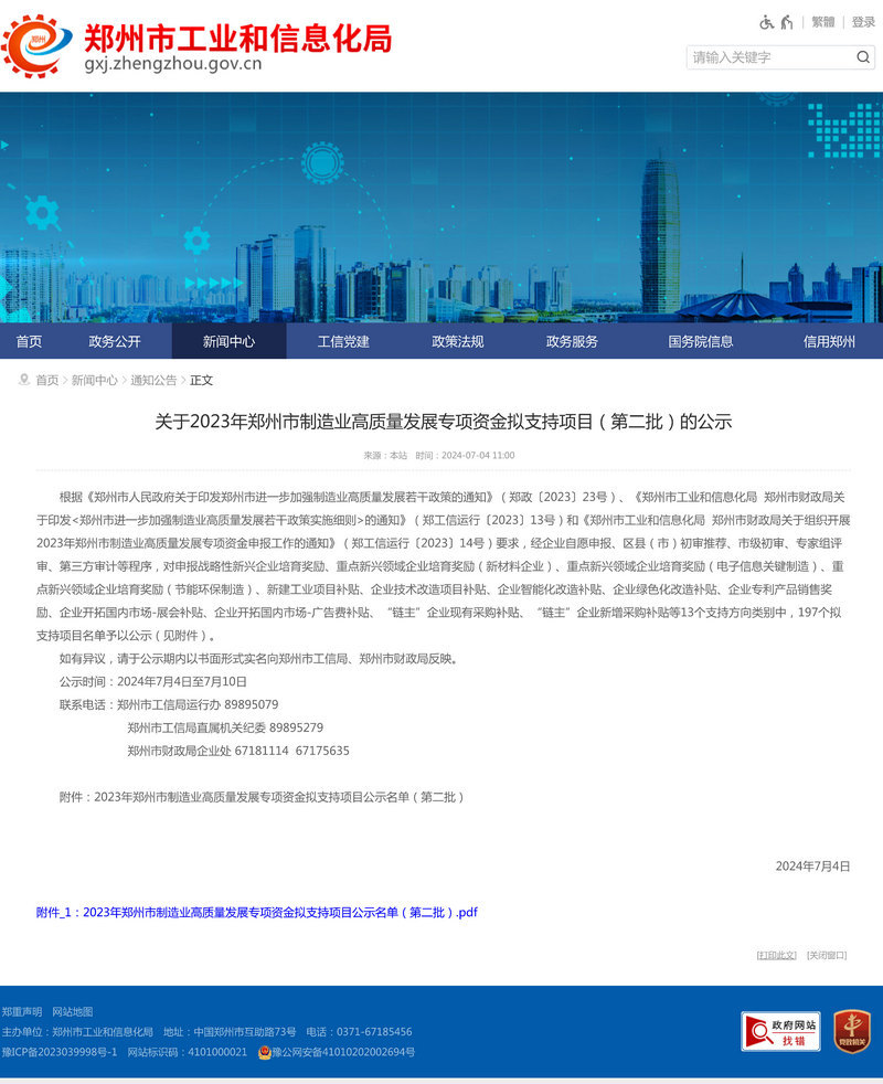 7月4日,郑州市工信局发布了《关于2023年郑州市制造业高质量发展专项资金拟支持项目(第二批)的公示》,OK138太阳集团获得“重点新兴领域企业培育奖励(节能环保制造)”方向的支持。