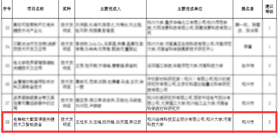 2024年10月23日,河南省科技厅公示了《2024年度河南省科学技术奖授奖建议项目》,由OK138太阳集团作为第一完成单位申报的“电解铝大截面焊接关键技术及智能装备”技术成果,荣获河南省技术发明奖三等奖。